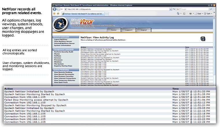 - Activity Logging [view screenshot] - log all all system shutdowns and user log-ons, as well as NetVizor actions: starting/stopping of monitoring processes, option changes, log accesses, and failed access attempts to start/stop monitoring.