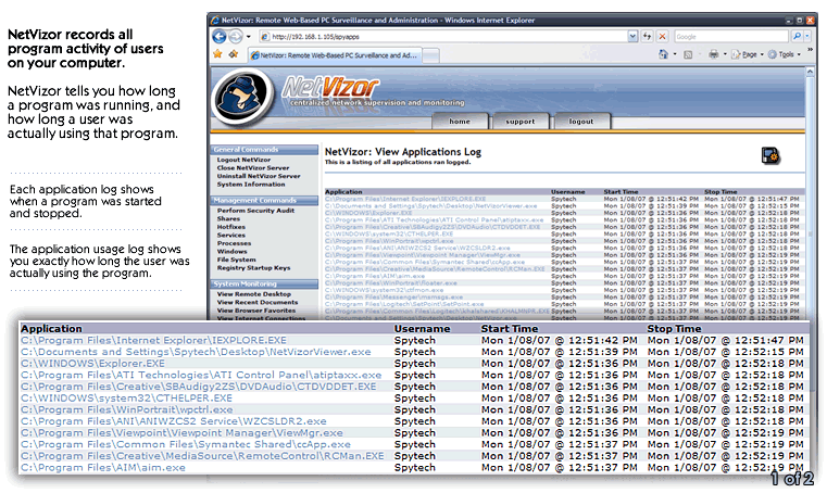 - Application Usage [view screenshot] - NetVizor corporate network monitoring software can monitor and log all applications ran by users - NetVizor logs when the application was started, stopped, and how long it was actually used. NetVizor also logs how long users were actually using each program.