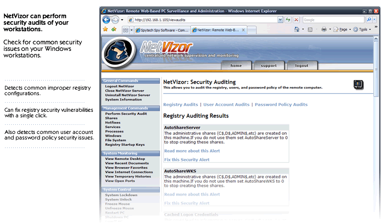 - Remote System Security Auditing [view screenshot] - Perform a security audit on network workstations - NetVizor can audit the remote workstations password and user policies, as well as improper registry settings, file shares, and trojan/virus infections. Registry audits can be fixed remotely as well via the NetVizor web interface.