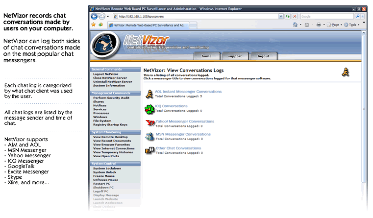 - Internet Chat Conversations [view screenshot] - NetVizor corporate network monitoring software can monitor and log both sides of all chat conversations made on chat clients. Supported clients include the latest versions of: AOL (including 9.0 and Optimized), AOL Instant Messenger, AIM Triton, Yahoo Messenger, MSN Messenger (including 6.x and 7.x), Excite Messenger, GoogleTalk, Skype, XFire, and ICQ (both Pro and Lite).