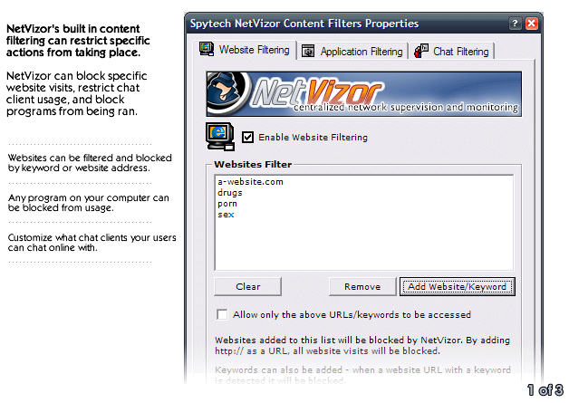 NetVizor corporate network monitoring software not only acts as a powerful spy software solution, but also as a content filtering tool. NetVizor can filter websites from being visited, applications from being ran by the user, and even chat messengers from being used while NetVizor is active.