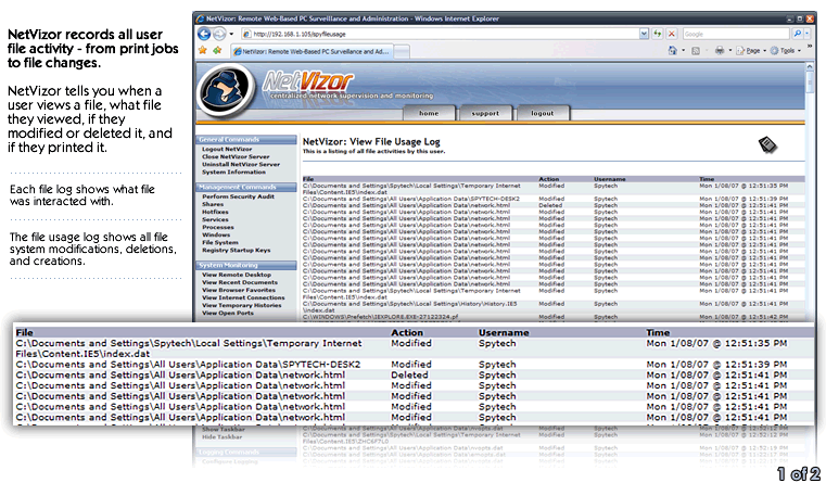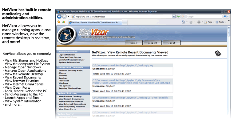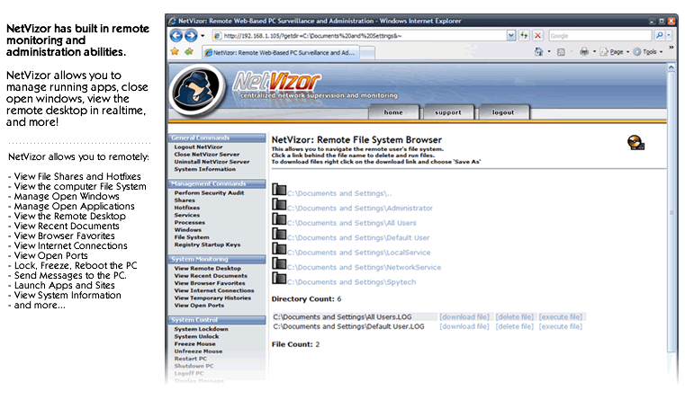- Remote File System Navigation and Management [view screenshot] - Browse and navigate the entire file system of the remote PC. The NetVizor remote file system browsing feature allows you to download, delete, and launch remote files - all through your web-browser!