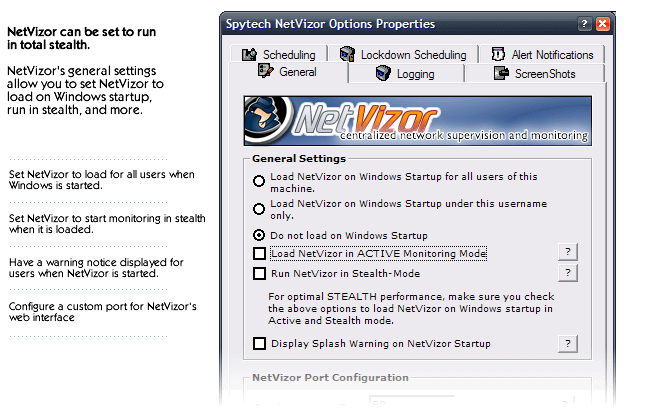 NetVizor corporate network monitoring software has a large array of security and stealth features. NetVizor is undetectable under all Windows versions (it does not even show up in the task manager on any Windows platform) and can circumvent popular third-party "spyware" detectors. NetVizor corporate network monitoring software has powerful lockdown and logging scheduling features, optional startup warnings, and much more.