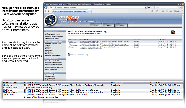 NetVizor Corporate Network Monitoring Software is the latest in powerful network surveillance and network monitoring spy software. Monitor your entire network from one centralized location! NetVizor allows you to track workstations and individual users that may use multiple PC's on a network.