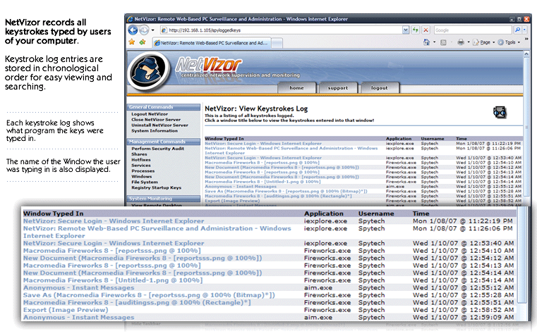 - Keystroke Monitoring [view screenshot] - NetVizor corporate network monitoring software can monitor and log all keystrokes along with the window they are typed in and time stamp.