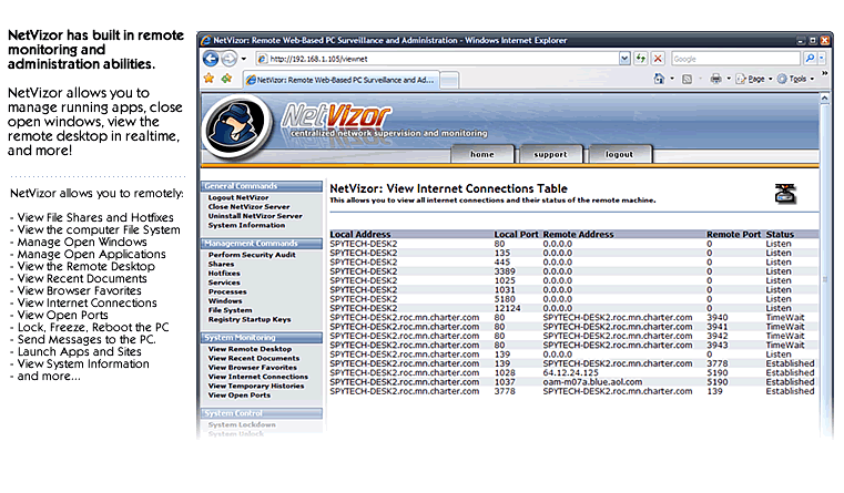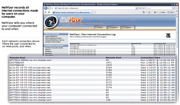 - Internet Connections [view screenshot] - NetVizor corporate network monitoring software can monitor and log all internet sessions made on the PC. This includes all FTP,HTTP, POP3, Chat Messenger, and any other TCP connections.