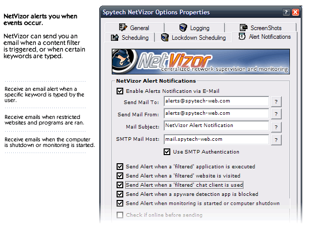 - Email Alerts [view screenshot] - NetVizor can be configured to send you email notifications when a user runs an unwanted website, chat client, or application. Alerts can also be sent when the computer is started/shutdown, and when spyware detectors are installed!