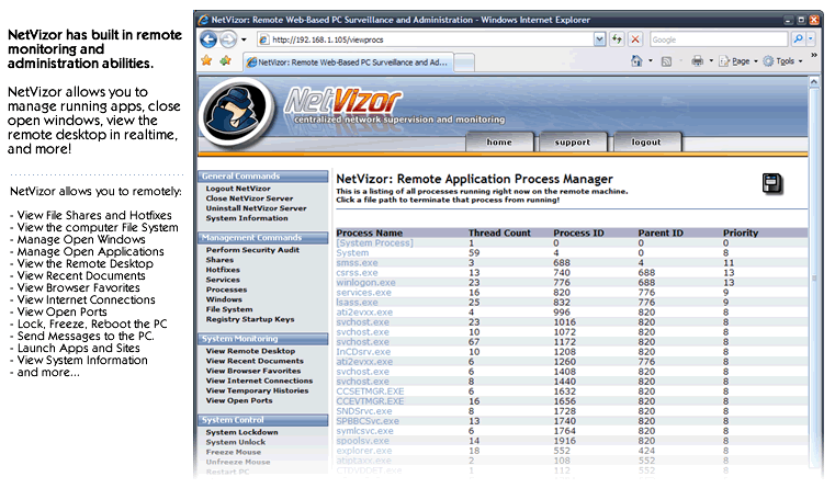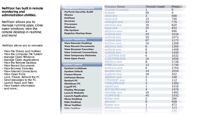 NetVizor corporate network monitoring software has built in remote administration features that allow the administrator to remotely control remote workstations. NetVizor allows for remote workstation security auditing, remote application and windows management, file system browsing, system lockdowns, and more!