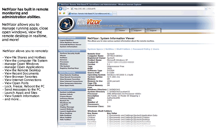 - Remote System Information Viewing [view screenshot] - With NetVizor Small Business Network Monitoring you can monitorView a listing of various system information for the remote PC, including processor type, system directories, and more!