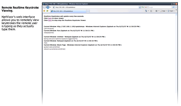 - Remote Realtime Keystroke Viewing [view screenshot] - View what users are typing in realtime as they type! NetVizor's realtime keystroke viewer will show every keystroke they type, as they type it, and categorize each keystroke under the window they type it in.
