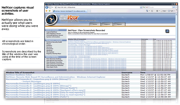 - Screenshot Capturing [view screenshot] - NetVizor corporate network monitoring software can take snapshots of your desktop at set intervals of time, allowing you to visually see what is happening. The ScreenShot capture manager also has a built in Slide show viewer for easy viewing.