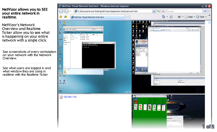 - Visual Network Overview [view screenshot] - Launch a visual network overview that shows you thumbnail screenshots representing each computer on your network at that moment. Each thumbnail links to a full size image of the remote computer's desktop