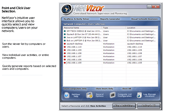 - Point and Click User Selection [view screenshot] - Click and select any monitored PC OR User on your network via NetVizor's centralized viewing console!