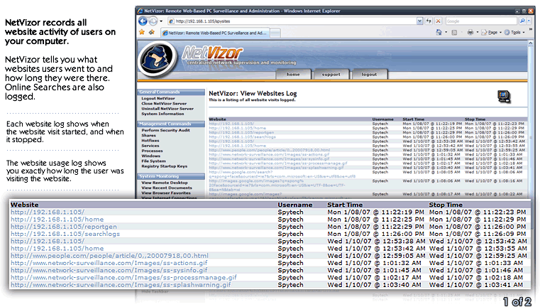 - Website Activity [view screenshot] - Log all websites visited by the popular browsers used today. All website visits are logged by website address, username, and duration of the site visit. NetVizor also logs how long users visit each website so you can easily see what websites are visited the longest. NetVizor supports the latest versions of the following browsers: Internet Explorer, Netscape, Opera, Mozilla, Firefox, and America Online.