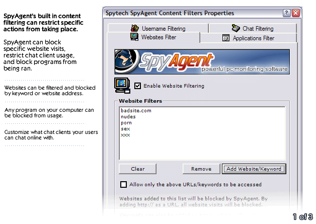 but also as a content filtering tool. SpyAgent can filter websites from being