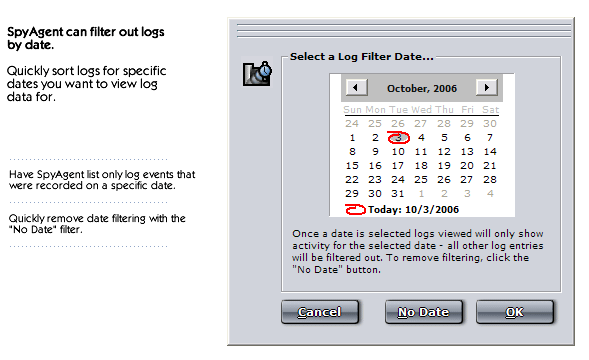 - Log Filtering [view screenshot] - Use the 'sort by day' feature in SpyAgent to easily view activities that only occurred on a specified date, rather than all activities at once.
