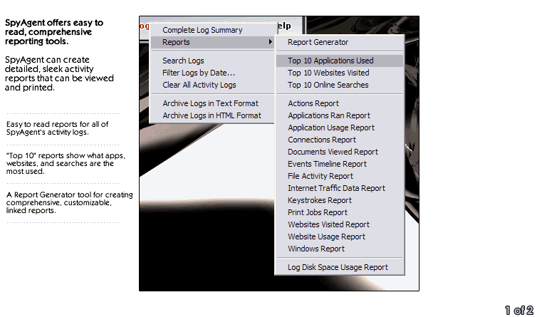- Log Reports [view screenshot] - SpyAgent top spy software has a large set of log reports at your disposal. SpyAgent's report generator can create Top 10 reports and log specific reports for viewing and printing.