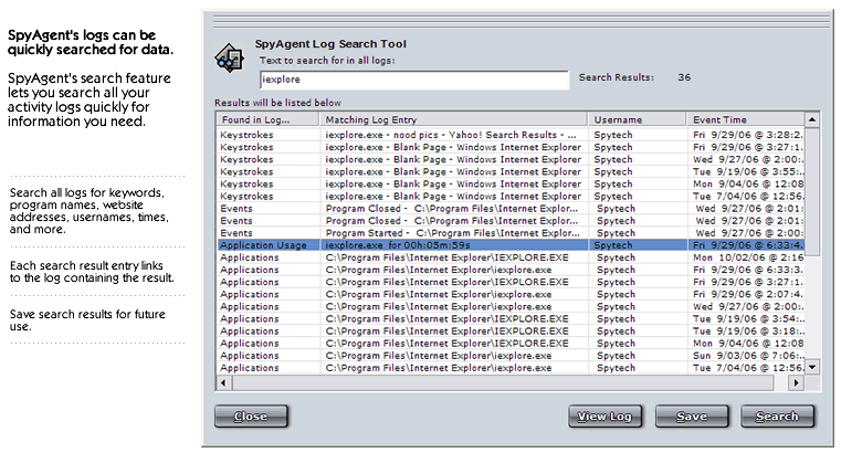 - Log Searching [view screenshot] - Quickly search all activity logs for specific keywords that may be contained in SpyAgent's logs.