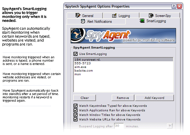 - SmartLogging - Activity Triggered Logging [view screenshot] - SpyAgent can be configured to start monitoring only when certain events occur. Such events can include specific keywords being typed, programs being ran, websites being visited, certain windows being viewed, and more.