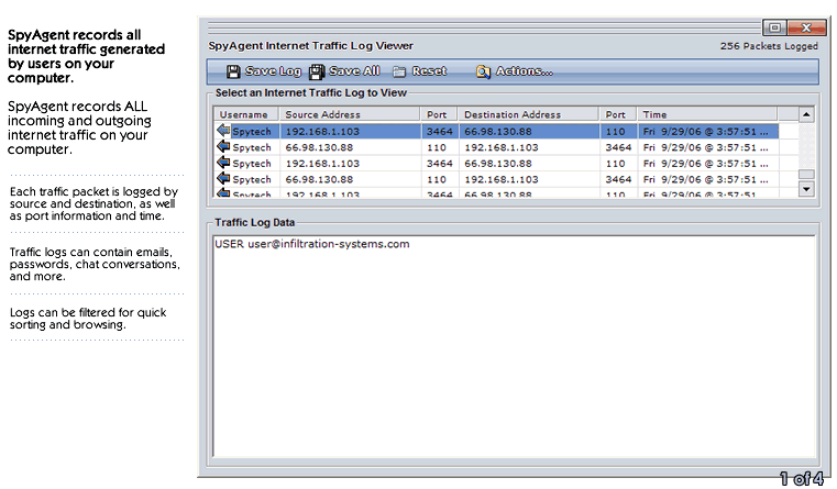 - Internet Traffic Data [view screenshot] - Monitor and log all internet traffic data that is sent and received by your computer. This data includes emails, website requests and contents, FTP sessions, passwords, chat conversations, and more.