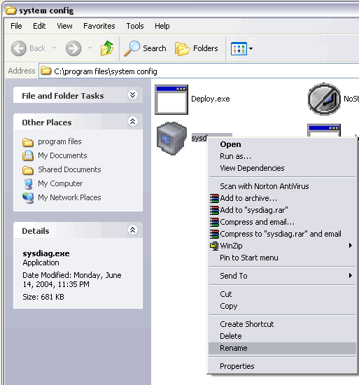 Right click on the sysdiag.exe file and choose RENAME from the menu by clicking on it.